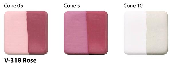 Rose is a deep magenta that is darker at cone 05/06, becomes patchy at cone 5/6 and burns out almost completely at cone 10. A clear glaze will accentuate the color at cone 05/06 but will remain relatively the same color at cone 5/6 and 10.
