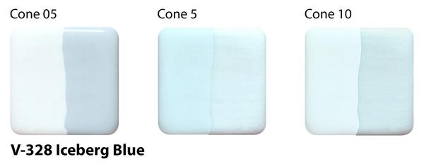 Iceberg Blue is a light blue with gray undertones.  It is a powder blue at cone 05, becomes darker at cone 5 and maintains its light blue shade at cone 10.  A clear glaze will lift some of the color out, slightly lightening it.