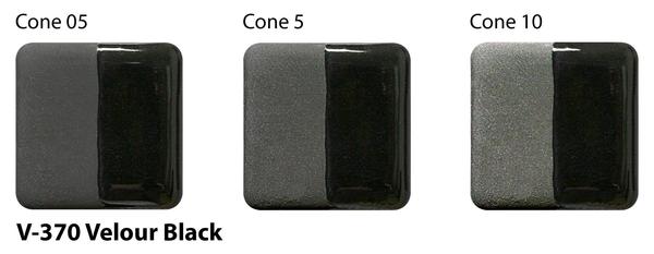 Velour Black is a warm black that is deep and velvety at cone 05/06.  AT cone 5/6 it darkens and becomes warmer and at cone 10 it becomes even darker.  A clear glaze will accentuate the color significantly at any temperature.