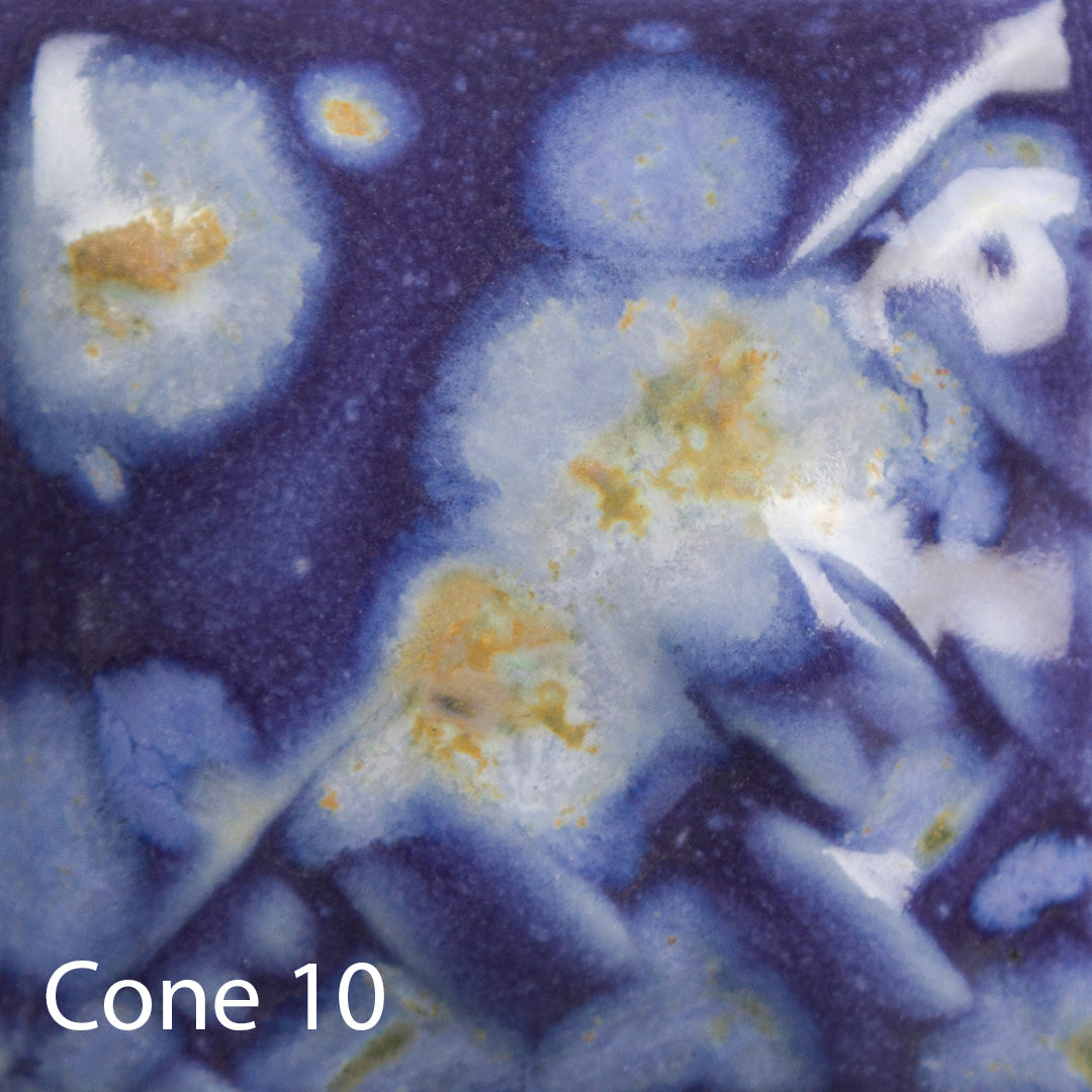 Cone 10: Glaze shifts to a semi-opaque variegated blue that breaks over texture. Crystals soften and lighten. Glaze remains stable.
