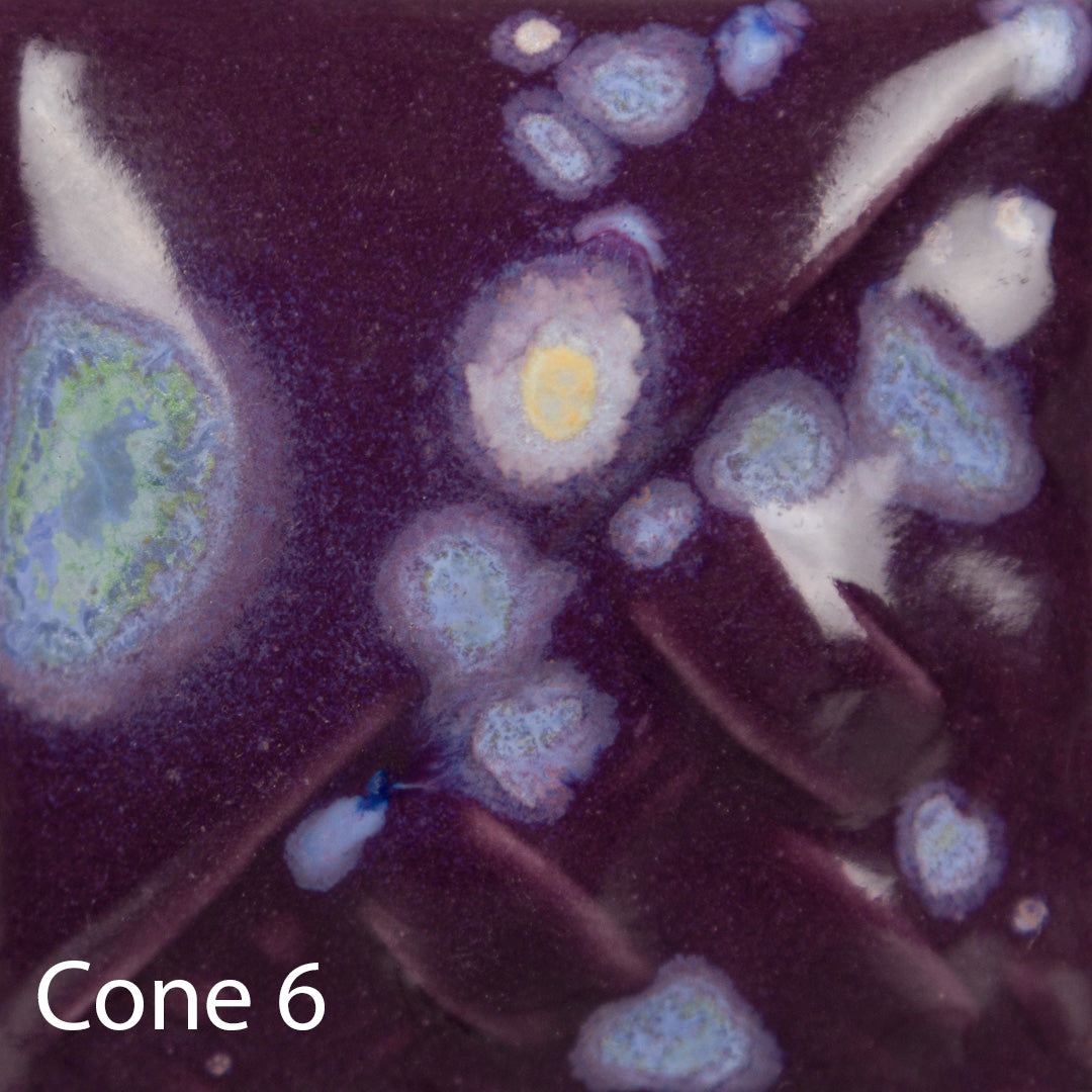 Cone 6: Passion Flower is a glossy, opaque, deep purple glaze with opaque crystals in varying sizes that bloom into shades of blue, green, and yellow.
