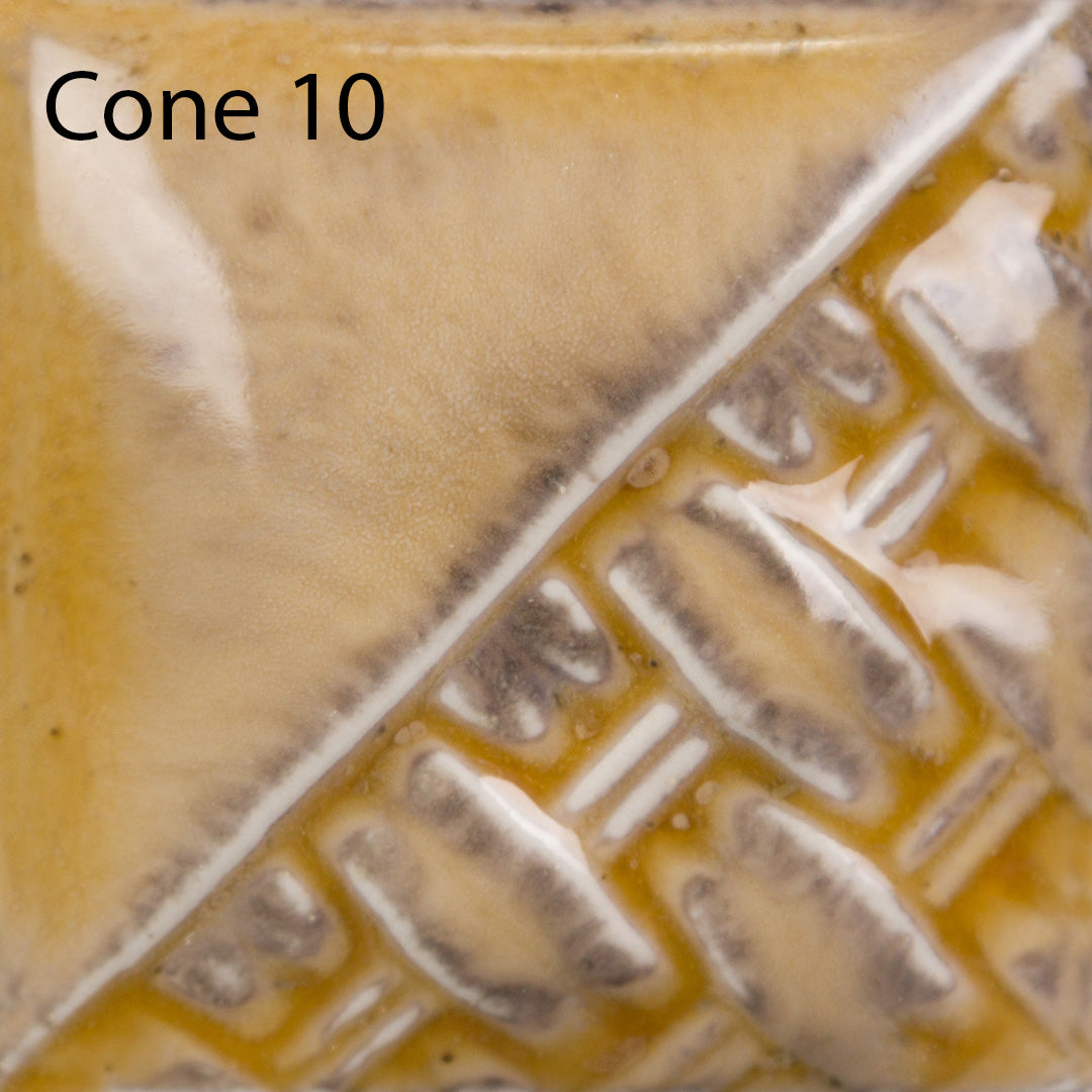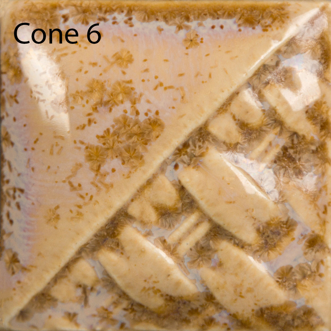 TIP: This glaze is fluid at 3 coats. Recede application to avoid unwanted runoff. Due to the translucent nature of this product, be aware of your application consistency and thickness to avoid streaky brushstrokes. We recommend firing our micro glazes to cone 6 oxidation to reach crystalline development. Micro Champagne achieves a stable, semi-opaque, golden-amber result that breaks over texture and has a pearlescent satin finish when fired to cone 5. Can be used in oxidation or reduction firings. Results may vary. The choice of clay body, thickness of application, firing process, and temperature will greatly affect the fired results. Always test your application on your clay body in your kiln environment.