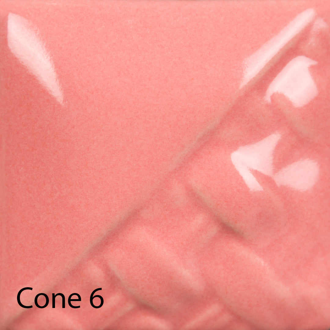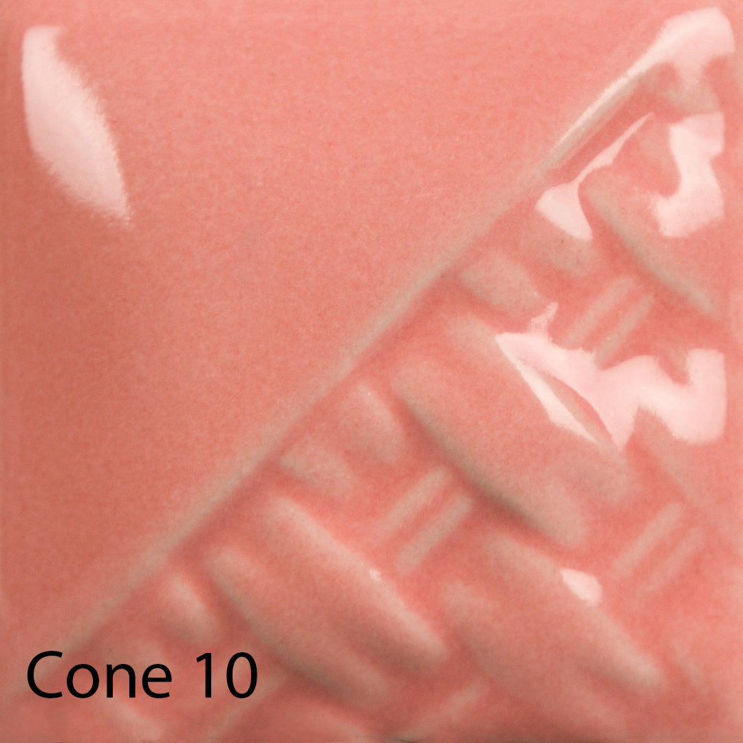 Cone 6 (first image): Pink Gloss is a glossy, opaque, medium pink glaze that is highly pigmented and formulated for stable design work at midrange temperatures and above.
