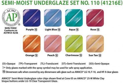 Set #110 includes the Orange, Rose, Light Blue, Chartreuse, Peach, Purple, Aqua, and Sun Tan colors of the Semi-Moist Underglazes. The SMUG's are formulated to respond similarly to being brushed like watercolors, becoming more opaque with layered application and more transparent after water is added. They can be blended and diluted to achieve a wide variety of effects.