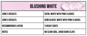 Blushing White is the perfect marriage of a soothing soft white and hints of pink. Apply an extra coat or two for an extra smooth gradient of pink tones. Give it an extra stir to mix well before use for best results. With it's semi-glossy finish, Blushing White is a welcomed accent, but is not recommended for use on dark clay bodies.