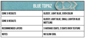 Blue Topaz is a glossy glaze providing a combination of flowing light blue hues like a summer pool. Benefiting from a thicker application, Blue Topaz is also great for textured surfaces and can be transparent where thinly applied.