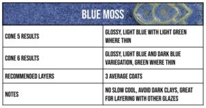 Blue Moss is a glossy glaze that is a perfect intersection of bold deep water blues meets flowing mossy greens. Great when applied individually, Blue Moss also shines when layered with other Mid-Fire glazes. When fired to Cone 5 this glaze gives magical lighter blue and green tones. With it's glossy finish, Blue Moss is a welcomed accent, but is not recommended for use on dark clay bodies.