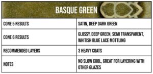 Basque Green boasts an exciting vintage green with suspensions of white lace across the surface. A semi-transparent gloss glaze, Basque Green elevates any surface whether applied individually or layered with other Mid-Fire glazes.