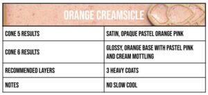 Orange Creamsicle is a gloss glaze bursting with soft sorbet colored oranges and cascading cream colors providing a whimsical finish on any surface. When fired to Cone 5 this glaze has less mottling for the perfect even layer of warmth. With either a standard application or a little extra layer, Orange Creamsicle will liven up any surface.