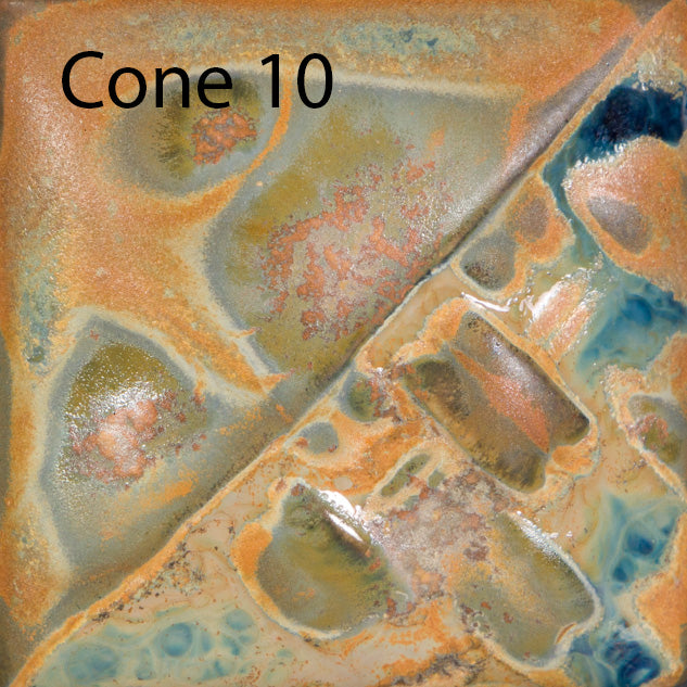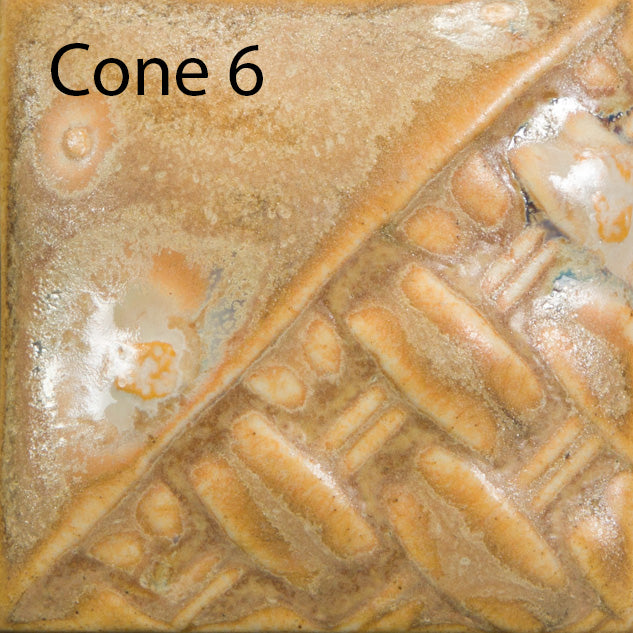 Cone 6: Desert Dusk is a warm amber matte glaze with crystals that melt into a glossy purple and blue. Heavier crystal application will produce more color variation.