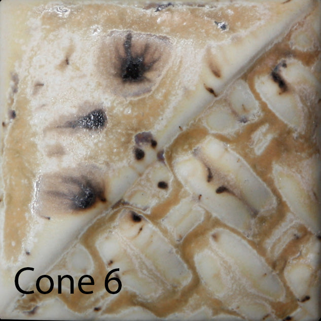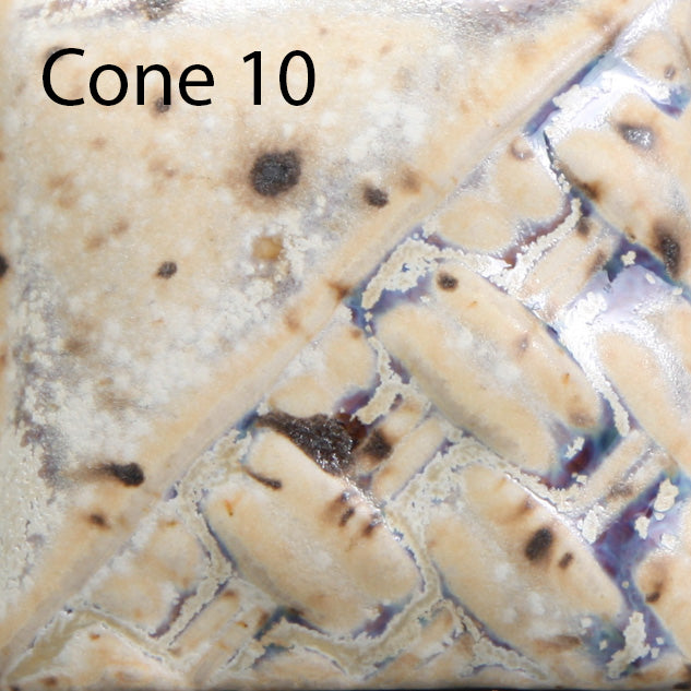 Cone 6: Sandstone is a matte, off-white glaze that contains a variety of brown crystals that melt during the firing. Thicker application and heavy crystal concentration will produce more glossy blue/purple variation.