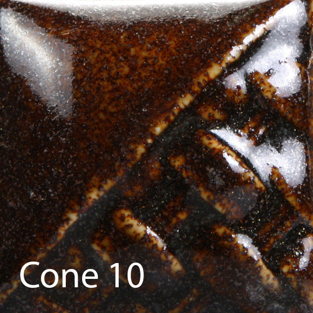 Cone 6: Fool’s Gold is a gloss, semi-transparent glaze consisting of a rich brown base with tiny, gold metallic flecks. The variation of glaze depends on application. The thicker the application, the more homogenous the color will be. The glaze will break translucent and pool darker around surface textures.