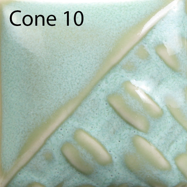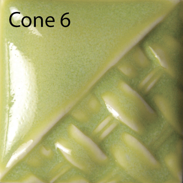 Cone 6: Green Opal achieves a vibrant chartreuse gloss when fired. Lighter applications lead to a semi-opaque yellow-green; heavier applications see the formation of a green float.
